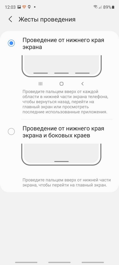 Как обычно у Samsung, здесь кроме обычных экранных кнопок (настраиваемых) и стандартных андроидных жестов есть еще и отдельный режим жестов только от нижней кромки. И именно этот режим лично я считаю самым удобным!