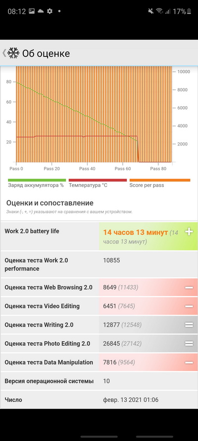 Синтетический тест PCMark - важный показатель. Больше 14 часов - отлично: это означает, что под серьезной нагрузкой смартфон спокойно продержится часов 18.