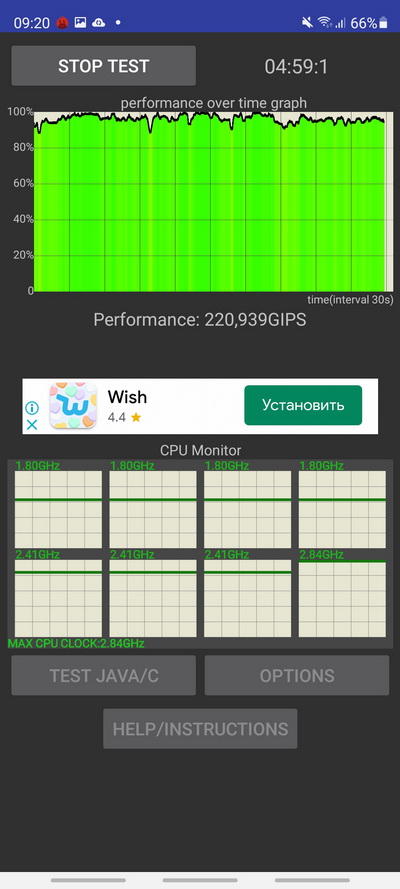 Тест на троттлинг - тоже хорошо, практически никакой потери производительности нет.