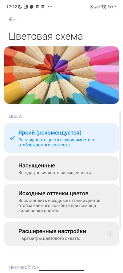 Настройки дисплея - стандартные для оболочки MIUI:  светлый и темный режимы, ночной режим, цветовая схема, режим чтения, частота обновления экрана, размер текста, масштаб.