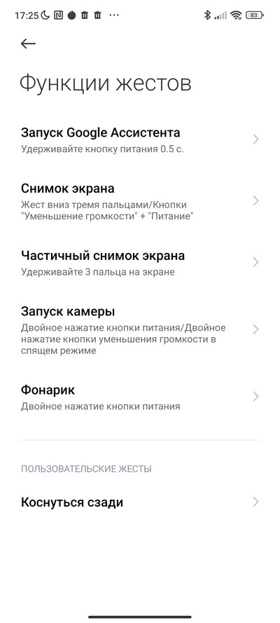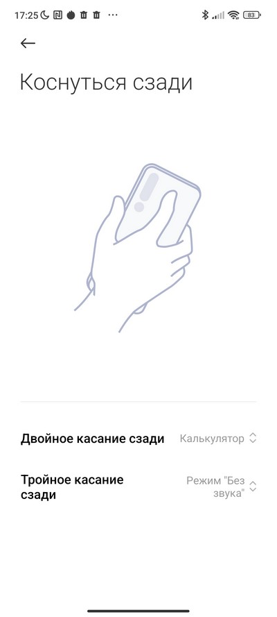 Также здесь неожиданно обнаружилась новая настройка - двойное и тройное касание задней крышки смартфона: там теперь тоже датчик есть. И работает нормально, причем срабатывает и когда смартфон находится в чехле (проверял на штатном силиконовом). Но, впрочем, одновременно тут велика вероятность ложных срабатываний при случайных касаниях.