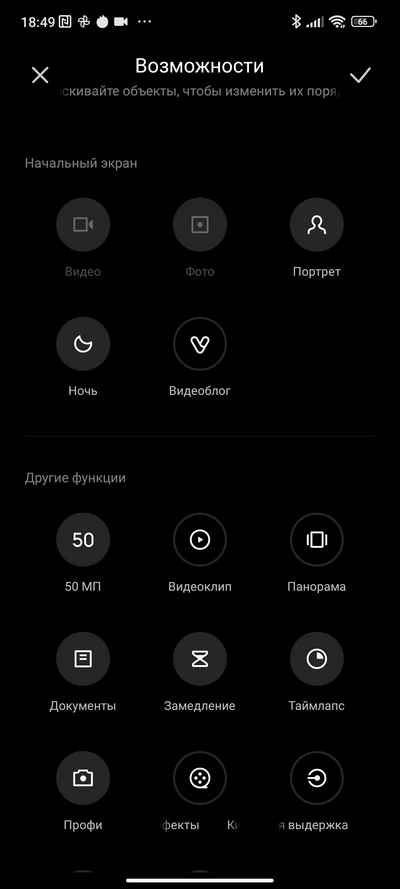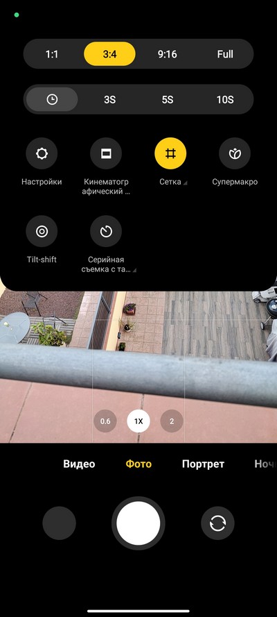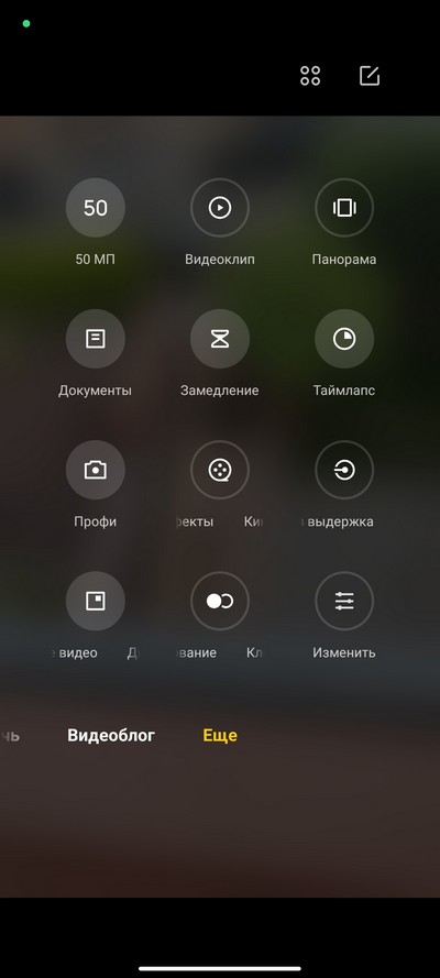 Интерфейс камеры. Снизу переключаются режимы: профи, видео, фото, портрет, 50 Мпикс, видеоблог (Vlog), и их набор настраивается. Выше переключение между сверхшириком, основной камерой и цифровым зумом (по умолчанию 2-кратный, но можно вызвать линейку зумов и масштабировать до 10-кратного). Сверху - пиктограммы различных переключателей и пиктограмма меню.  На правом скриншоте - окно меню с настройками.