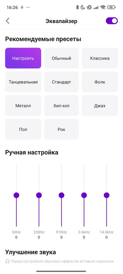 Как обычно, есть настройки под разные типы наушников, звуковые эффекты.