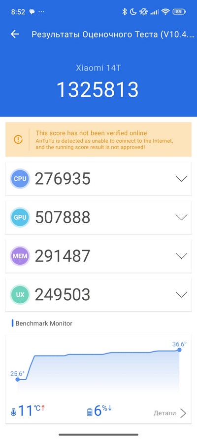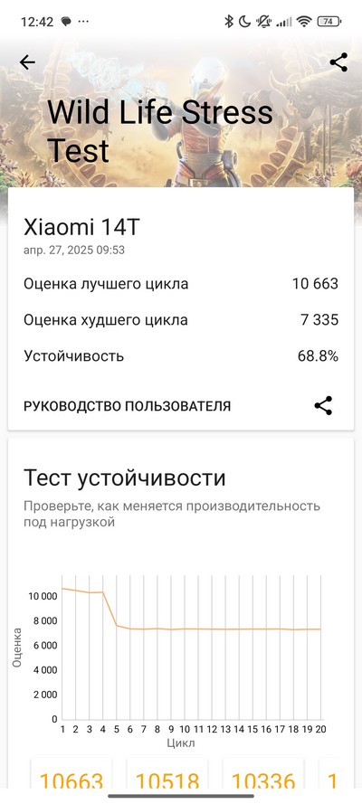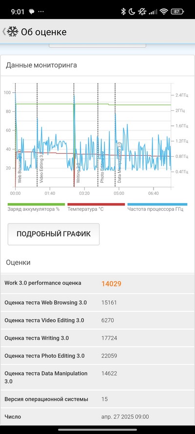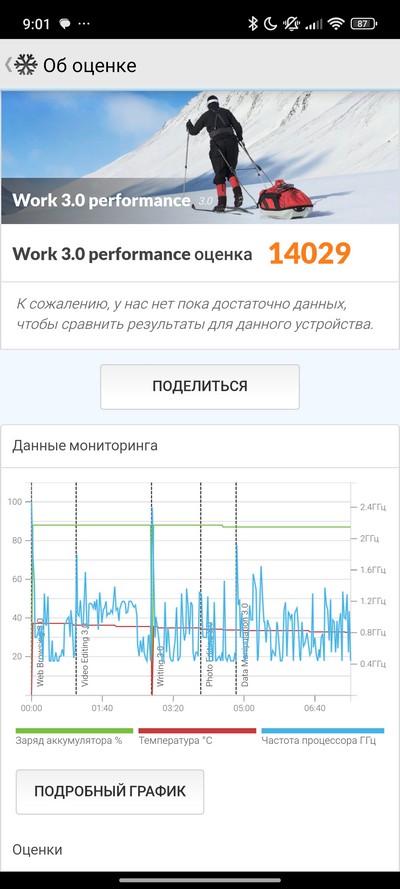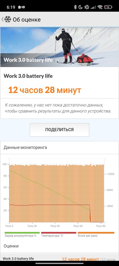 Синтетический тест PCMark. Неплохой показатель, он означает, что при серьезной нагрузке весь день смартфон должен продержаться. Но по предыдущим тестам я ожидал, что будет порядка часов 15-16.