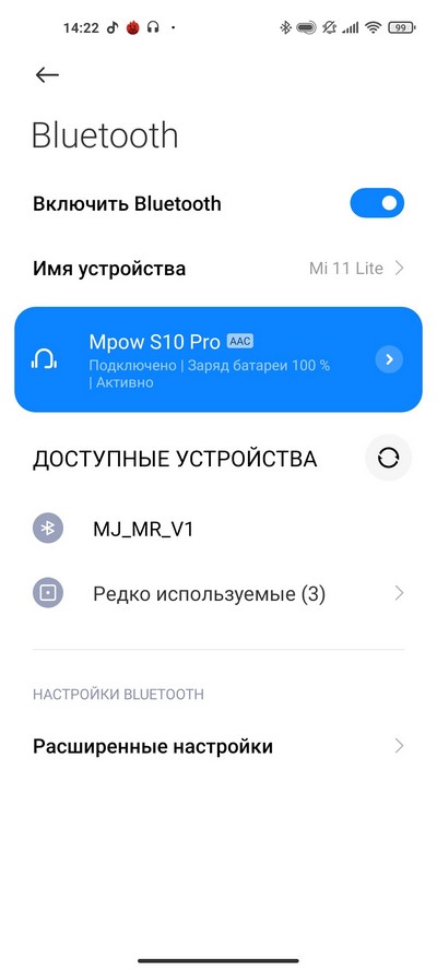 Для проверки беспроводного звучания подключил наушники Mpow S10 Pro. Наушники подключились по кодеку AAC.