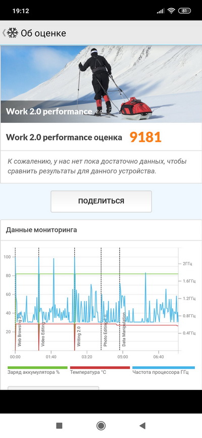 Синтетический тест PCMark - это очень важный параметр, который чисто практически показывает, как себя смартфон поведет при серьезной загрузке (у меня это называется режимом "в дороге"). Приложение у меня почему-то вырубилось практически во время окончания теста, по времени там должно было быть семь с небольшим часов. Это относительно немного, я ожидал порядка девяти-десяти часов.