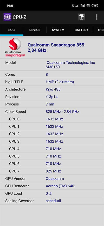 Процессор: Qualcomm Snapdragon 855 (8-ядерный, архитектура Kryo 485, 7-нм техпроцесс, тройная архитектура, поддержка графического драйвера Vulkan 1.1)