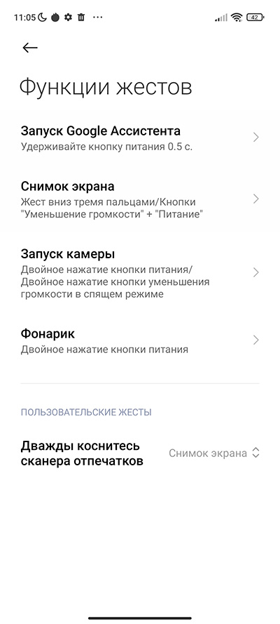 Управлять смартфоном можно с помощью экранных кнопок или с помощью стандартных жестов. (Это настраивается в разделе "Безграничный экран".) Из дополнительных жестов - запуск "Ассистента", снимок экрана, запуск камеры и фонарик.