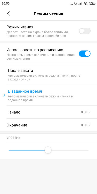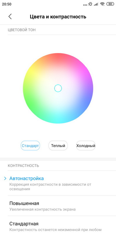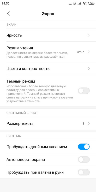 Присутствуют стандартные для Xiaomi гибкие настройки экрана: цвета и контрастность, размер шрифтов, режим чтения, темный режим.