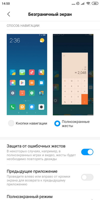 Стандартные для MIUI два варианта управления: кнопками навигации и полноэкранными жестами, которые здесь достаточно продвинутые (к обычным "Возврат", "Домой" и "Список запущенных задач" еще можно добавить возврат к предыдущему приложению и вызов меню программы.