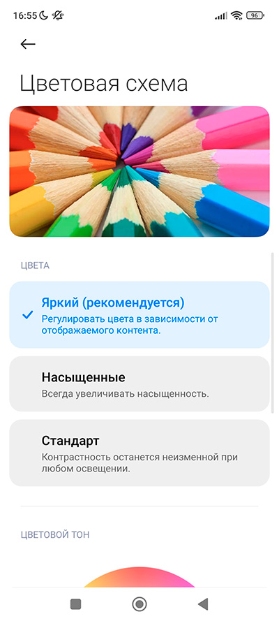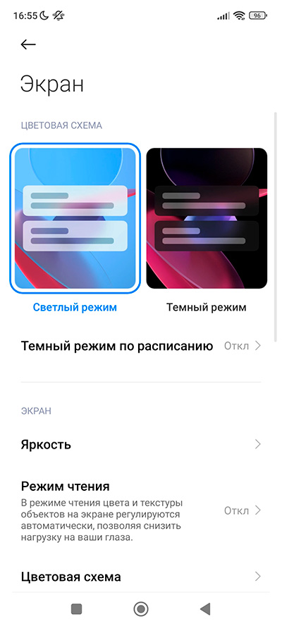 Настройки дисплея - стандартные для оболочки MIUI:  светлый и темный режимы, ночной режим, цветовая схема, режим чтения, частота обновления экрана, размер текста, масштаб.