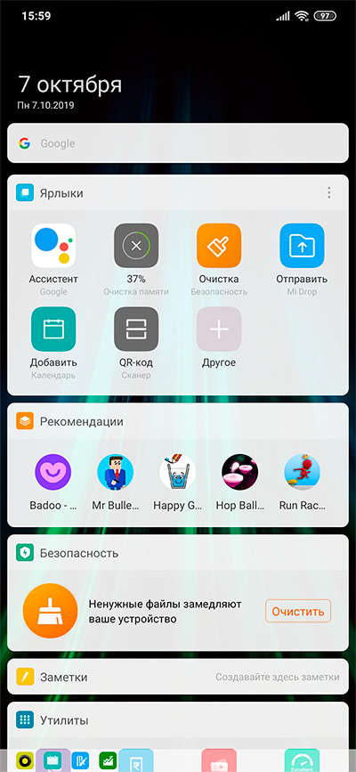 Стандартные настройки Xiaomi я неоднократно рассматривал в обзорах, здесь настройки почти не отличаются от настроек Xiaomi Mi 9, так что, если нужны подробности, отправляю к обзору Mi 9, здесь не вижу смысла повторяться.