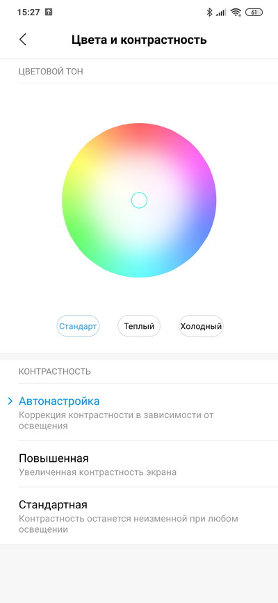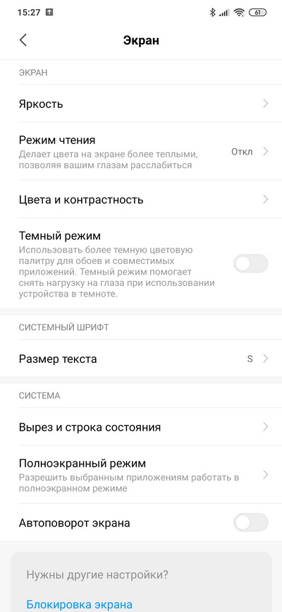 Экран гибко настраивается: цвета и контрастность, есть темный режим, режим чтения. "Каплю" с селфи-камерой можно скрыть - сделать верхнюю полосу черной.
