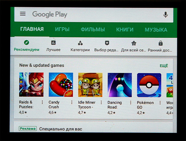 Обычный Google Play. Но даст установить только те приложения, которые могут работать с данной платформой и данным разрешением экрана.