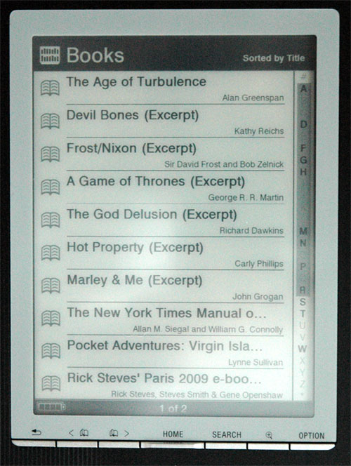 Здесь книги можно выбирать пальцем, а главное - с помощью пальца или стила можно перемещаться по нужным буквам названия (или автора, в зависимости от вида сортировки) и быстро находить требуемое издание.