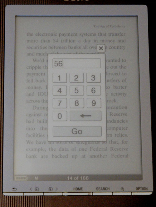 Кнопки листания страниц теперь стали менее удобными, старая окружность с углублениями позволяла меньше перемещать большой палец при листании. НО! Теперь вы можете листать страницы, просто проводя пальцем по экрану - примерно так, как в iPhone. Технически это выглядит следующим образом: держите книжку двумя руками, а когда нужно перевернуть страницу, проводите большим пальцем правой руки горизонтальную линию в 1-2 см в нижней части экрана - номер страницы увеличивается. Большим пальцем левой руки страницы можно листать назад. После того как поймаете нужную зону и поймаете нужное усилие (небольшое, разумеется), листание страниц не будет вызывать никаких затруднений. И уж это, конечно, значительно более удобно, чем давить на кнопки! При определенной сноровке ридер можно держать в одной руке и большим пальцем этой же руки листать страницы - у меня это получалось без проблем. Причем пальцем той же руки можно листать назад - просто проводя линию не слева направо, а справа налево.