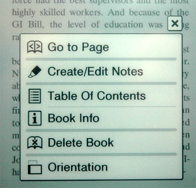 Table Of Contents вызывает оглавление, Book Info - различную полезную информацию (тип, размер, где находится), Delete Book - удаление книги, Orientation - смену расположения текста с портретного на альбомный и наоборот.