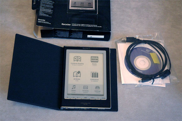 Комплектация у PRS-700 практически такая же, как и у PRS-505: ридер, отстегивающаяся папка, стандартный кабель USB-miniUSB, софт с программой eBook Libruary. Блок питания в комплект не входит еще с версии PRS-505. С одной стороны, это не сильно удобно, потому что, если устройство разрядится полностью, быстро его реанимировать можно только с помощью блока питания. Однако если блока нет, то сойдет и питание через USB, просто придется подождать несколько часов, чтобы устройство накопило первоначальный набор стартового тока.
