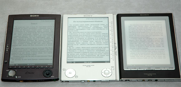 Вот все три поколения ридеров. Даже по уменьшенной фотографии видно, что у первой модели (PRS-500) электронная бумага серая, а не белая, у второго поколения (PRS-505) бумага белая и буквы выглядят очень контрастно, а у новой модели (PRS-700) подложка белая, но контраст букв заметно понижен по сравнению с PRS-505. Текст как будто в "молоке".