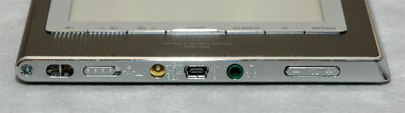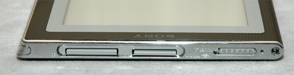 Верхний торец - точно такой же, как в PRS-505: кнопка включения-выключения, слоты для двух карточек памяти - SD и Memory Stick Duo.