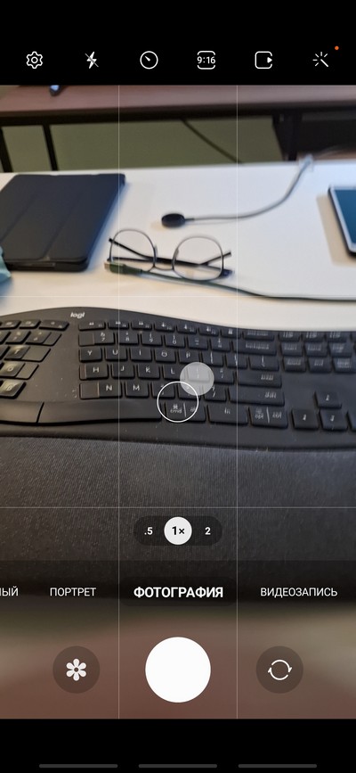 Интерфейс камеры. Сверху - пиктограммы быстрых настроек и общих настроек. В нижней части экрана - переключения между двумя камерами и цифровым (то есть просто кадрирование) двукратным увеличением. Еще ниже - переключение между режимами съемки. При смене камеры появляются пиктограммы двух камер и различных цифровых увеличений.