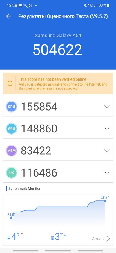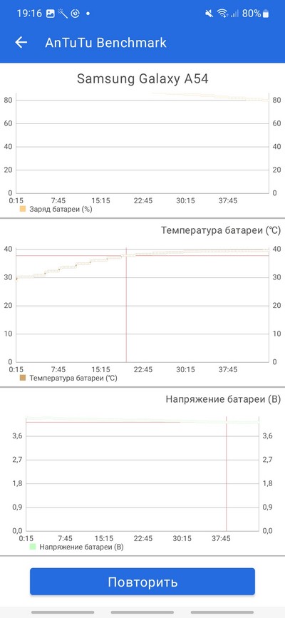 Стресс-тест AnTuTu. Температура до 40 градусов не поднялась, была максимум 38.