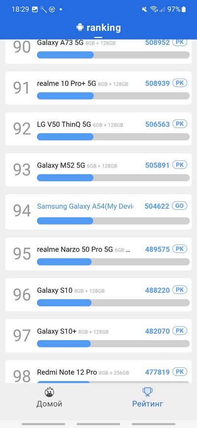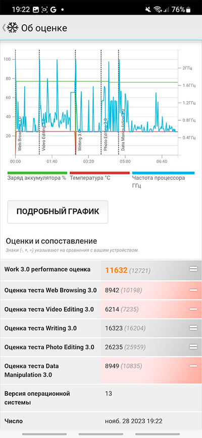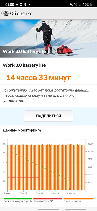 Синтетический тест PCMark. И тут тоже отличный результат: смартфон продержался практически на треть дольше, чем предыдущая модель с таким же аккумулятором.