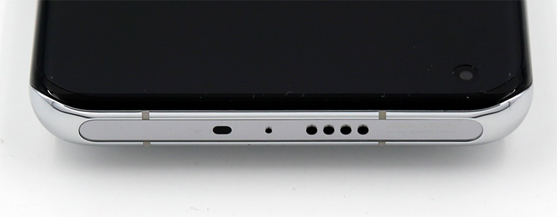 На нижней грани - слот под сим-карты, порт USB-C, микрофон, прорезь динамика, к которой подошли творчески, - она смотрится лучше, чем отверстия одинакового размера.