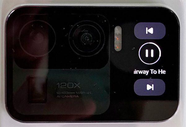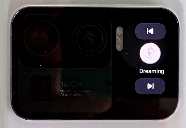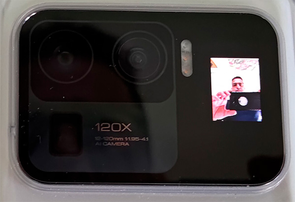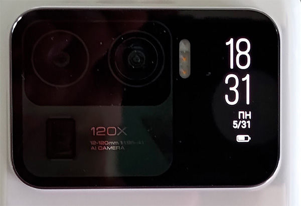Здесь, как я уже упоминал, есть второй OLED-дисплей, встроенный в блок камер. Сам дисплей - тот же самый, который установлен в фитнес-браслете Xiaomi Mi Smart Band 5.