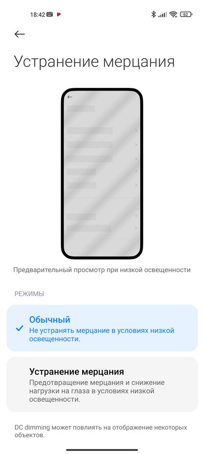 Но здесь в настройках есть режим подавления мерцания (редкость для Xiaomi). Включил, измерил на 25% яркости - мерцание получилось 21,2%, это фактически в норме (на 50% яркости - порядка 17%). То есть мерцание при необходимости можно снизить - для тех пользователей, которые к этому чувствительны.