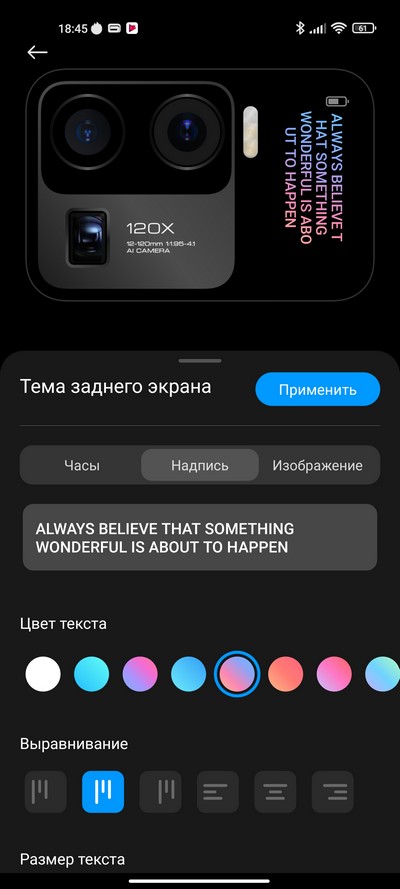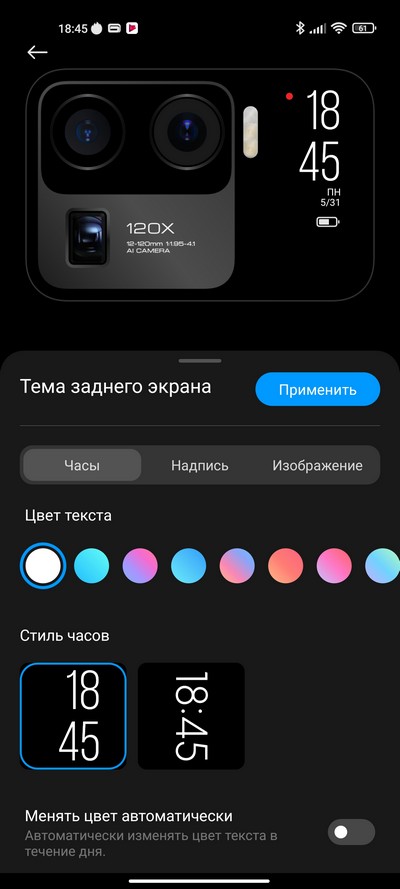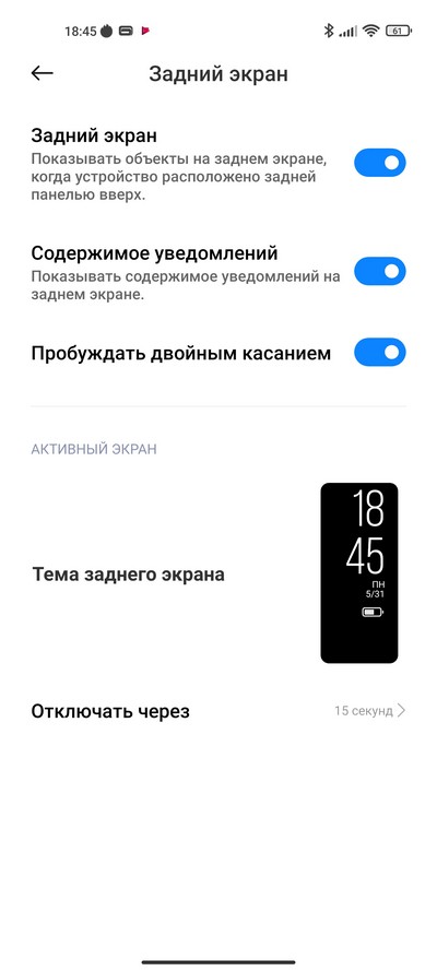 Ну и замечу, что, по сути, этот дисплей совершенно бесполезен. Здесь же есть режим постоянно включенного экрана, то есть у вас на дисплей выводится нужная информация, так что никто не будет поворачивать смартфон и нажимать на этот крохотный дисплей, чтобы увидеть время и дату.