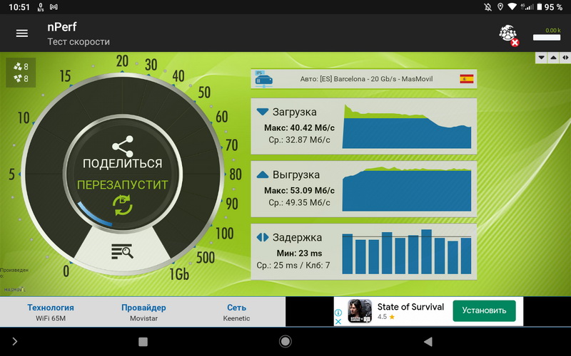 Тест скорости Wi-Fi (планшет поддерживает только 2,4 ГГц). Терпимо. Сравнил в тех же условиях с бюджетным смартфоном, поддерживающим только 2,4 ГГц (у меня остальные смартфоны поддерживают 5 ГГц, поэтому нет смысла сравнивать) - тот выдал порядка 55 Мб/с на вход и 82 Мб/c на выход. Похоже.