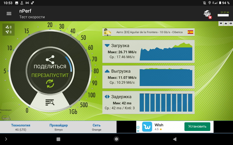 А это уже тест сим-карты на 4G. Нормально, среднебюджетный смартфон с сим-картой того же провайдера выдал скорости 15 Мб/c и 8 Мб/c.