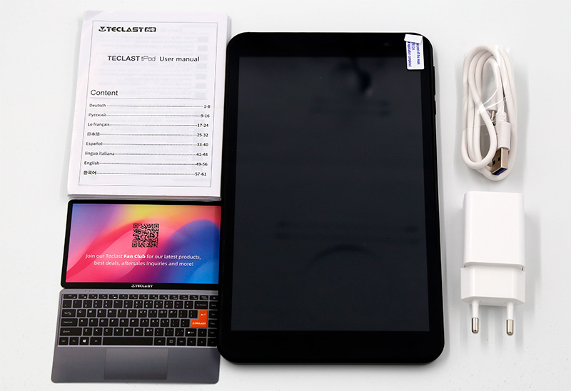 Комплект поставки: планшет, адаптер питания, кабель USB - Type-C, руководство пользователя на различных языках, включая русский, и трогательная бумажка с QR-кодом, приглашающая вступить в Fan Club Teclast. Мило, очень мило. Надо было еще VIP-карточку приложить, раз такое дело. Все-таки крутой планшет почти за семь тысяч рублей.