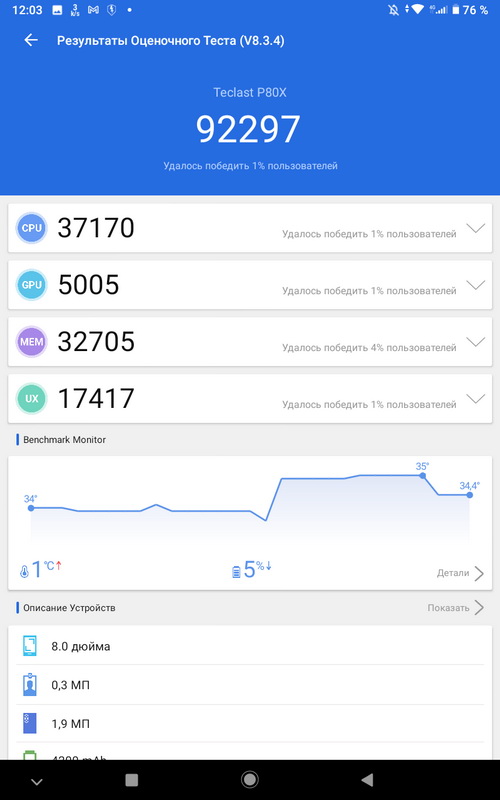 Стресс-тест AnTuTu. Пристойно, температура незначительно поднялась за 40 градусов.