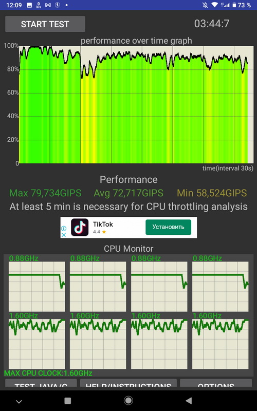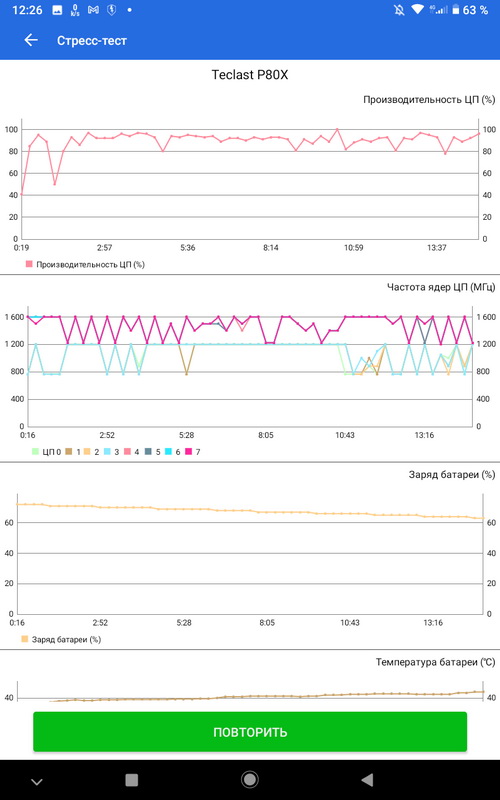 Тест троттлинга (падения производительности при нагрузке) - все нормально, производительность почти не падает.