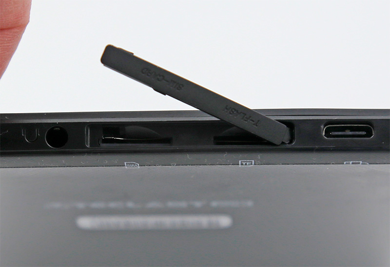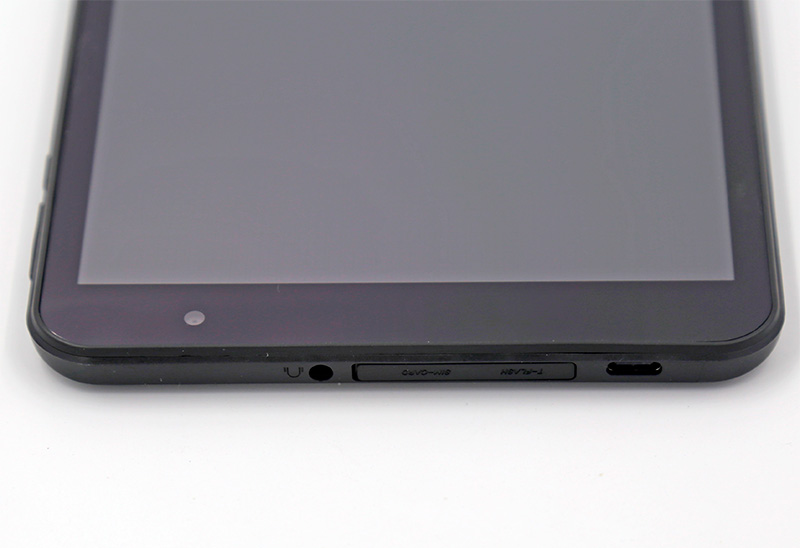 На верхней грани - аудиовыход, под заглушкой слоты под карту памяти и microSIM, порт Type-C.