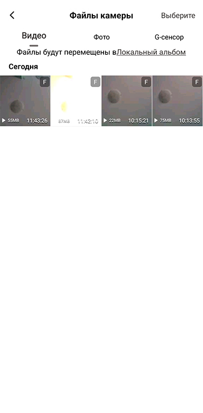 Файлы камеры можно просматривать в приложении: все видео, фото, срабатывание G-сенсора, защищенные видео. И их можно перемещать в локальный альбом смартфона.