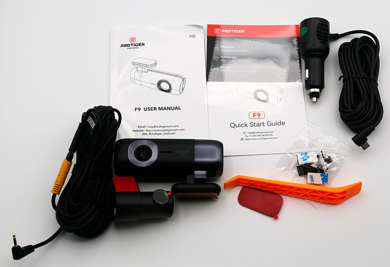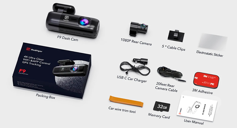 В комплекте: видеорегистратор, задняя камера, пять клипс с липучкой для прокладки кабеля, кабель для подключения к автомобильному адаптеру, кабель для соединения задней камеры с передней, дополнительная липучка для держателя видеорегистратора, инструмент для снятия прилепленного держателя, карта памяти 32 ГБ, руководство пользователя.