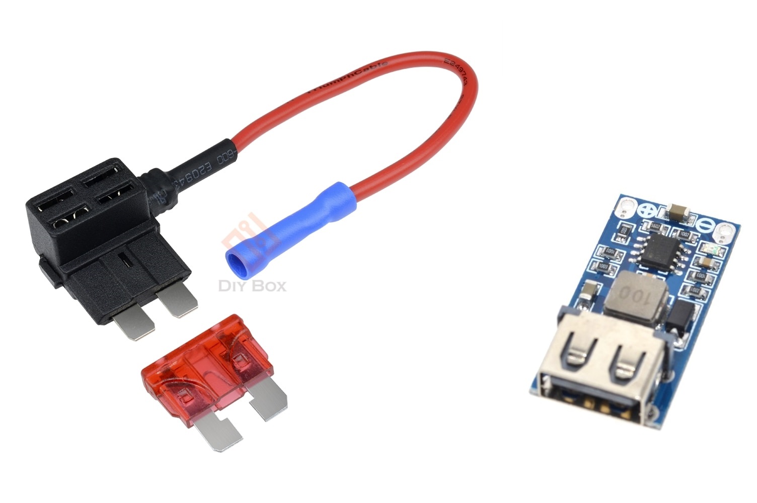 Вскрывать снова накладку не хочу, мороз однако. В ближайшем автомаге купил провод с клеммой и встроенным предохранителем, припаял к валявшемуся модулю USB и всё затянул в термоусадку. Вот примерные фото того, что использовал: