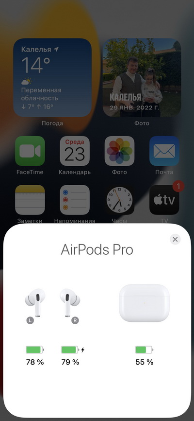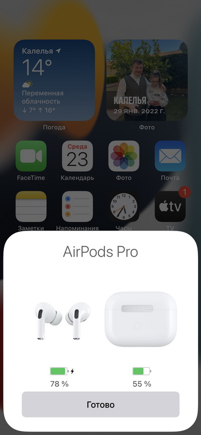 При подключении к наушникам айфон будет показывать уровень заряда кейса и каждого наушника по отдельности.