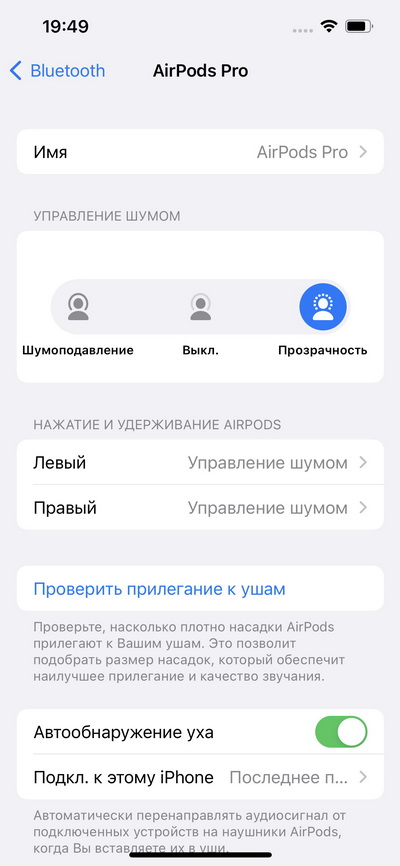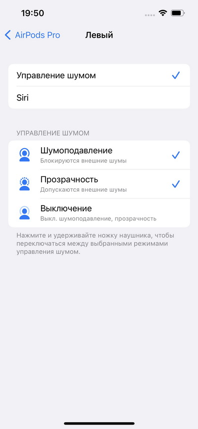 Тут также можно переключать режим работы (обычный, шумоподавление, режим прозрачности), назначать действия при длинном нажатии на левый и правый наушники.