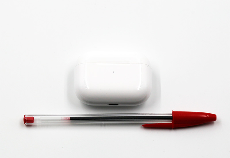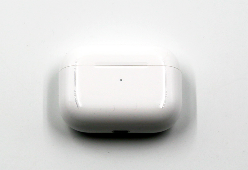 Зарядный кейс выполнен из глянцевого пластика. Верхняя и нижняя грани кейса скруглены, так что стоять на поверхности он не может, может только лежать. Крышка магнитная, открывается достаточно легко. На передней части кейса расположен светодиод, демонстрирующий режим зарядки и режим сопряжения. На нижней грани расположен порт Lightning. На задней части кейса расположена кнопка принудительного перевода наушников в режим сопряжения.