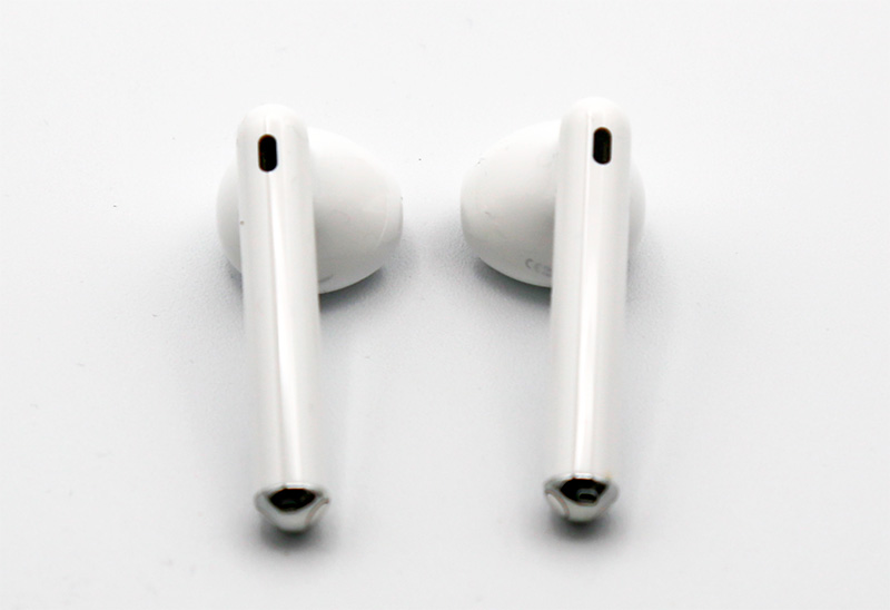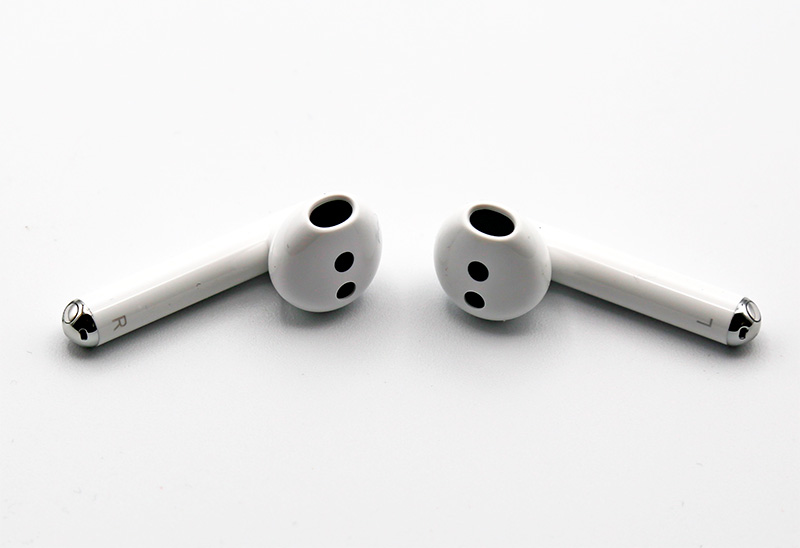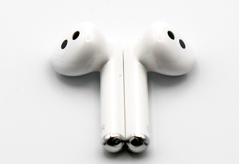 На внутренней грани наушников - два отверстия, прикрытые сеткой. Одно из них - компенсационное, оно также служит для улучшения передачи низкочастотного диапазона, второе - это инфракрасный датчик, который определяет, находится ли наушник в ухе или нет. На верхней грани каждого наушника находится небольшое отверстие, под которым скрывается микрофон для шумоподавления. Разговорные микрофоны находятся в ножках наушников.