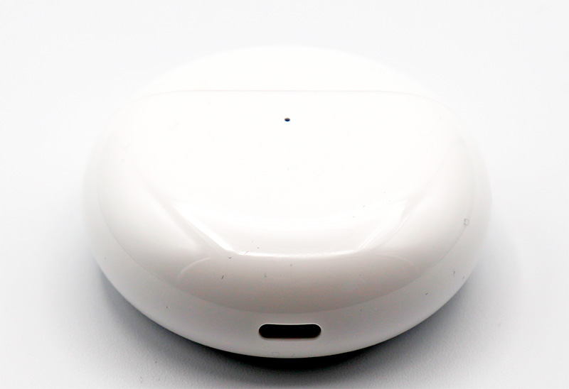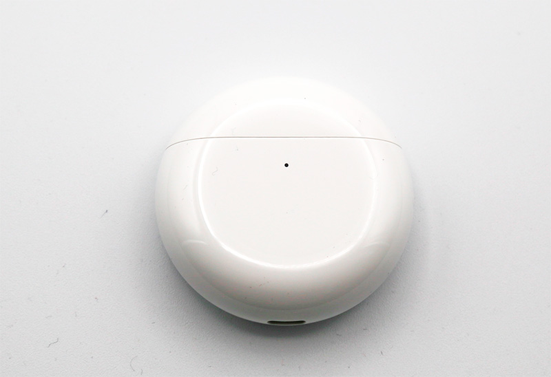 Кейс из белого глянцевого пластика. На лицевой части кейса расположен светодиод, демонстрирующий процесс зарядки.
