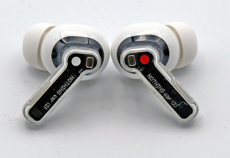 Сами наушники. Формат у них такой же, как у Apple AirPods Pro, но дизайн вполне оригинальный и стильный, смотрятся они действительно здорово. Правый наушник отмечен красным кружком, левый - белым. Управление у них такое же, как у Apple AirPods Pro: слегка утопленная площадка в нижней части ножки, которую нужно сжимать. И это отличное решение (я об этом еще в обзоре AirPods Pro писал), потому что пользоваться даже удобнее, чем касаниями сенсорного слоя, а ложные срабатывания при этом совершенно исключены!