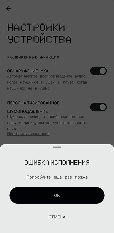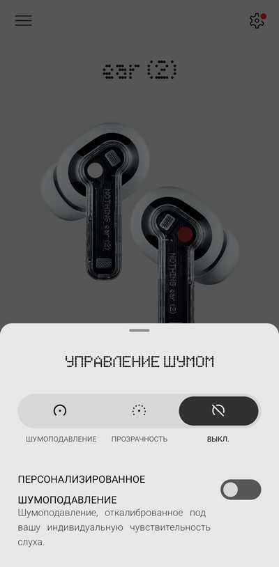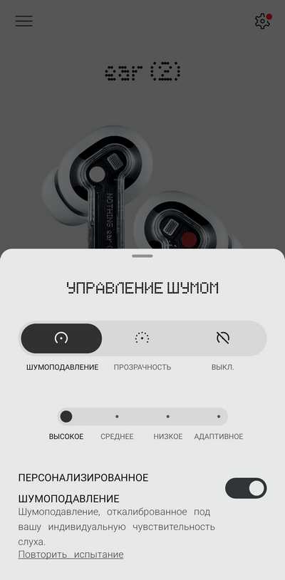 У наушников есть режим прозрачности (очень полезно при использовании, например, на улице) и два режима шумоподавления: обычный и персонализированный.