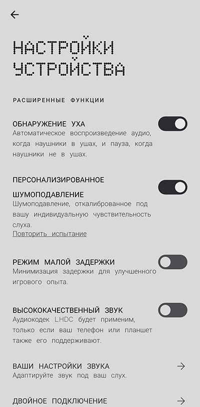 Настройки наушников. Как видите, также есть опция режима малой задержки и активация аудиокодека LHDC (если смартфон его поддерживает).