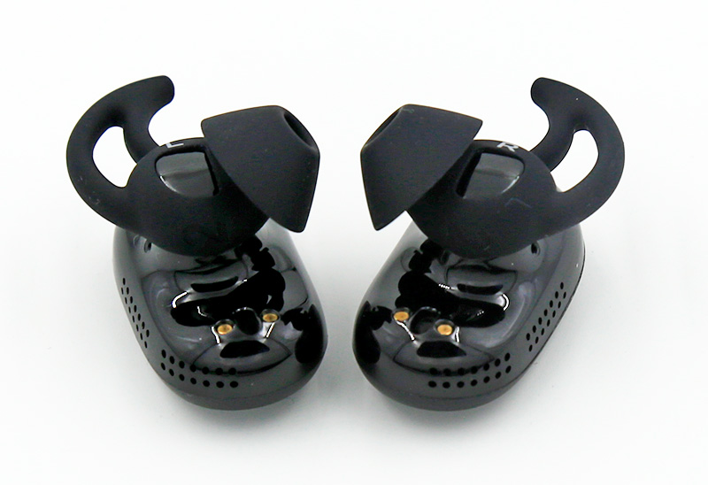 На внутренней поверхности наушников расположены контакты для зарядки. Амбушюр и ушной крючок, надежно удерживающий устройство в ушной раковине, здесь соединены в единое целое, тогда как в очень многих TWS-наушниках аналогичного типа амбушюры с крючками разъединены.