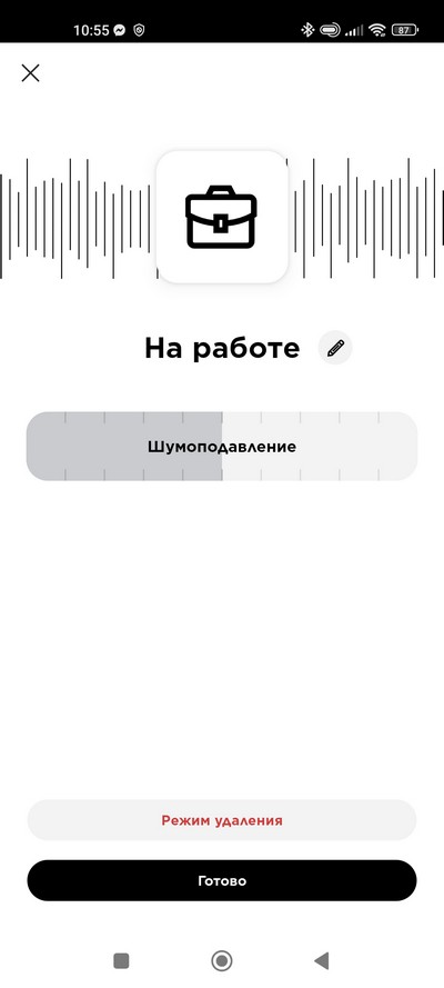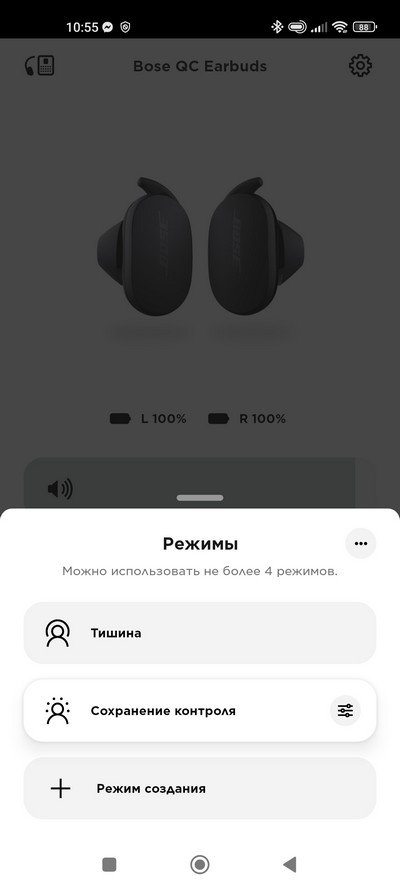 Режимы работы могут настраиваться. По умолчанию установлены два режима: режим максимального шумоподавления и, наоборот, режим максимальной прозрачности. Выбранный режим можно запоминать (есть опция), и тогда он будет включаться при следующем подключении наушников.